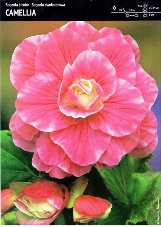 Begonia bulwiasta dwukolorowa (Begonia bicolor) odmiana Camellia to roślina kwitnąca na przepiękny różowy kolor, a jej płatki kwiatowe przybierają białą barwę na brzegach. Kwiat begonii Camelia przypomina układem małą różę. Roślina dorasta do wysokości 20-35 cm i wytwarza również ozdobne liście, w kształcie serca. Begonia ta kwitnie od około czerwca, aż do pierwszych przymrozków. Różowa begonia Camelia będzie stanowiła doskonałą ozdobę w doniczkach i skrzynkach na balkonie czy tarasie ale także na rabatach kwiatowych w ogrodzie.
