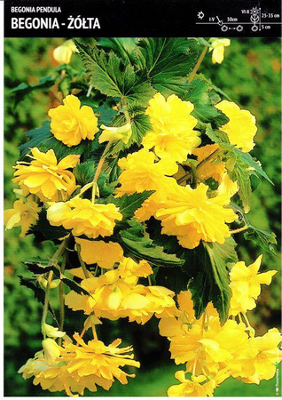 Żółta begonia bulwiasta zwisająca kaskadowa (Begonia pendula) to roślina, która najchętniej wybierana jest do obsadzania różnego rodzaju podwieszanych mis, skrzynek balkonowych lub wysokich donic. Wprowadza ruch i dynamikę, a żółte kwiaty dają ożywienie i świeżość. Tworzy duże, pokaźne kwiaty. Begonia kaskadowa dobrze komponuje się z innymi zwisającymi roślinami, które są tłem dla dużych i wyrazistych kwiatów. Roślina tworzy pędy o długości do 35 cm, a dodatkową dekoracją są jej sercowate liście.