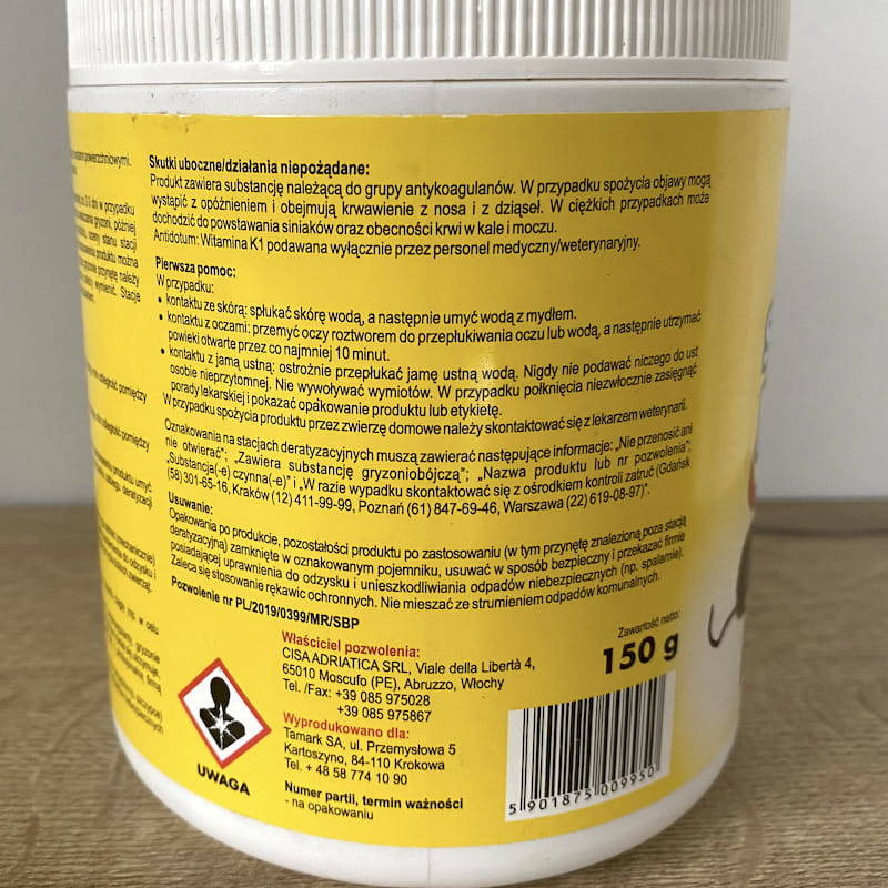 W przypadku zwalczania szczurów: Stosować przynętę 60-100 g w pojedynczym karmniku na każde 100 m2 powierzchni.