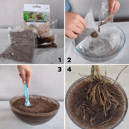 1. Poprzez moczenie korzeni. Jest to najbardziej efektywny sposób, gdyż dokładnie pokrywamy całą powierzchnię korzeni, dając mikoryzie natychmiastową możliwość rozwoju. Jedno opakowanie 150 g wystarczy do aplikacji do około 30 małych sadzonek lub 3 większe drzewa.
