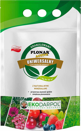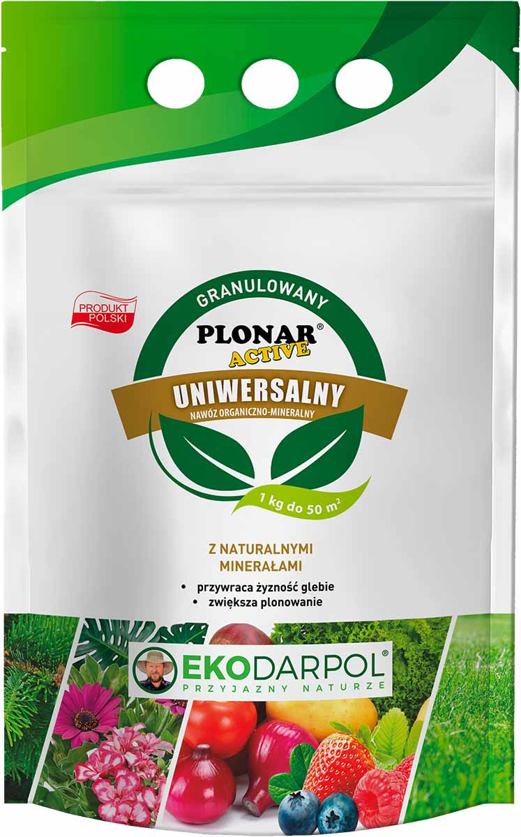 Plonar Active od Ekodarpol to idealny nawóz do zasilania i ulepszania struktury gleby pod uprawę warzyw, drzew i krzewów owocowych, a także roślin ozdobnych, iglaków i traw. Przyczynia się nie tylko do zwiększenia plonów, ale również poprawia ich walory odżywcze i smakowe. Zaledwie 1 kilogram tego ekologicznego granulowanego nawozu organiczno-mineralnego zastępuje aż 1 tonę obornika.