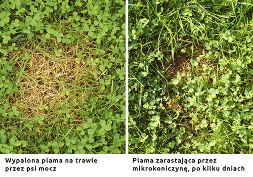 Mikrokoniczyna łąkowa (Trifolium repens) wykazuje wysoką tolerancję na psi mocz* i posiada zdolność do jego rozkładu. Dzięki symbiozie z pożytecznymi mikroorganizmami glebowymi trifolii, azot mocznikowy zostaje przekształcony w formy azotu przyswajalne dla roślin i wbudowywany w ich organizm. W efekcie psi mocz staje się swoistym nawozem i następuje efekt samo nawożenia się murawy.