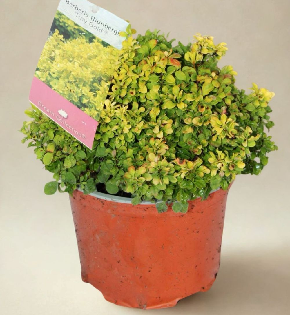 Berberys Thumberga Tiny Gold to dekoracyjny, karłowaty krzew liściasty o płaskim, półkolistym pokroju i pięknie wybarwionych liściach koloru żółtego. Dorasta od 2 m do 3 m wysokości, dzięki czemu świetnie sprawdzi się w mniejszych ogrodach na balkonach czy rabatach. Późną wiosną zakwita drobnymi, żółtymi kwiatami o intensywnym zapachu. Pod koniec sierpnia kwiaty Berberysu zamieniają się w drobne jasnoczerwone owoce.