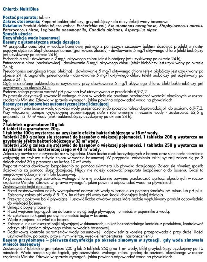 - Przy napełnianiu basenu wodą o jakości wody przeznaczonej do spożycia należy doprowadzić pH do poziomu 6,9-7,2. Przy włączonej pompie cyrkulacyjnej zapewniającej stałe i równomiernie mieszanie wody - zastosować 62,5 g (3-4 tabletek) preparatu na 10 m3 wody (efekt bakteriobójczy uzyskujemy po okresie 24 h).