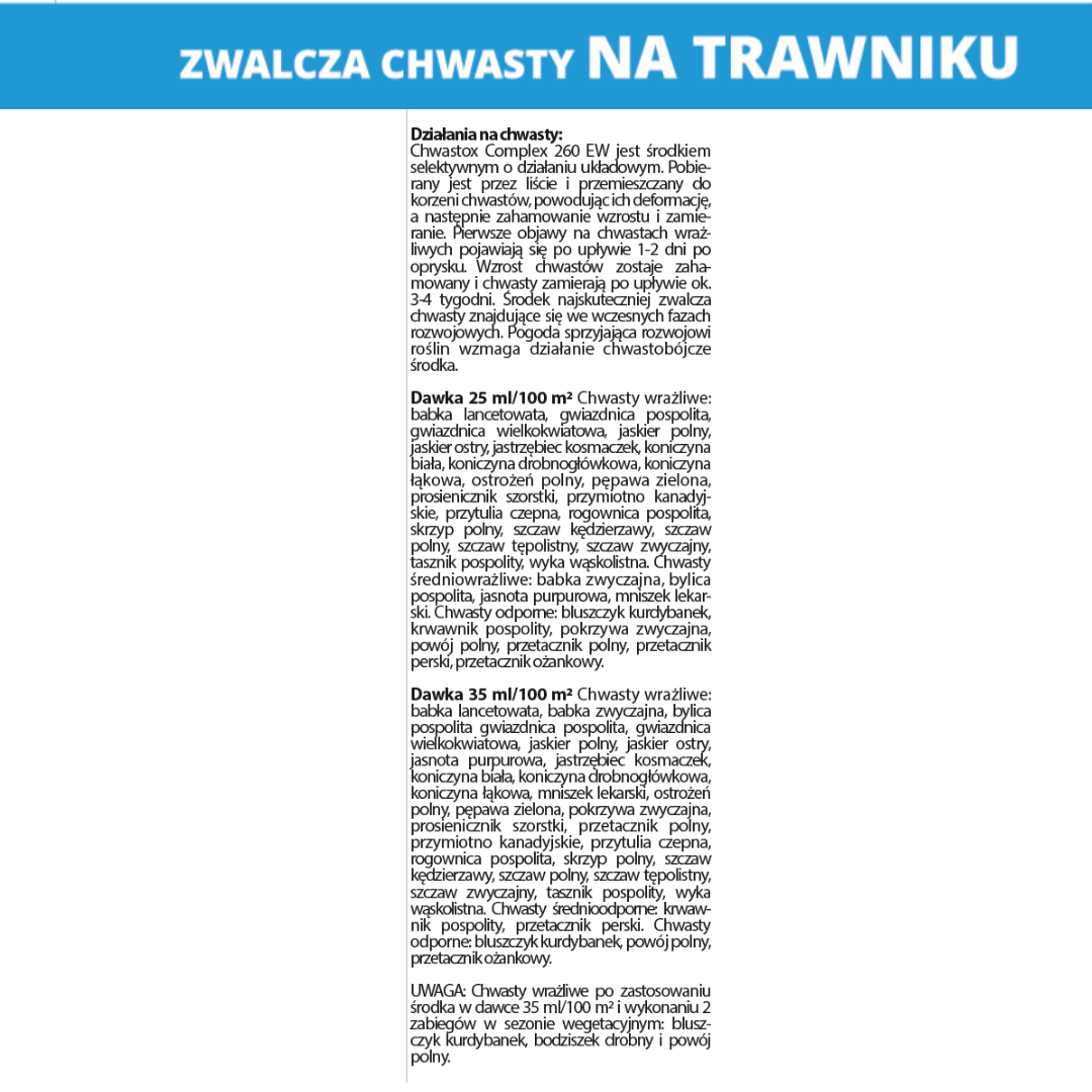 Chwastox Complex 260 EW do zwalczania chwastów dwuliściennych na trawnikach to skuteczny preparat ułatwiający pielęgnację trawnika. Jak działa Chwastox? Składniki środka są pobierane przez liście chwastów powodując ich deformację, zahamowanie wzrostu i zamierania roślin. Produkt działa kontaktowo i stosowany jest dolistnie. Dzięki temu, że preparat przenika do korzeni i powoduje ich obumieranie, jego działanie jest długotrwałe i skuteczne już od pierwszego użycia.
