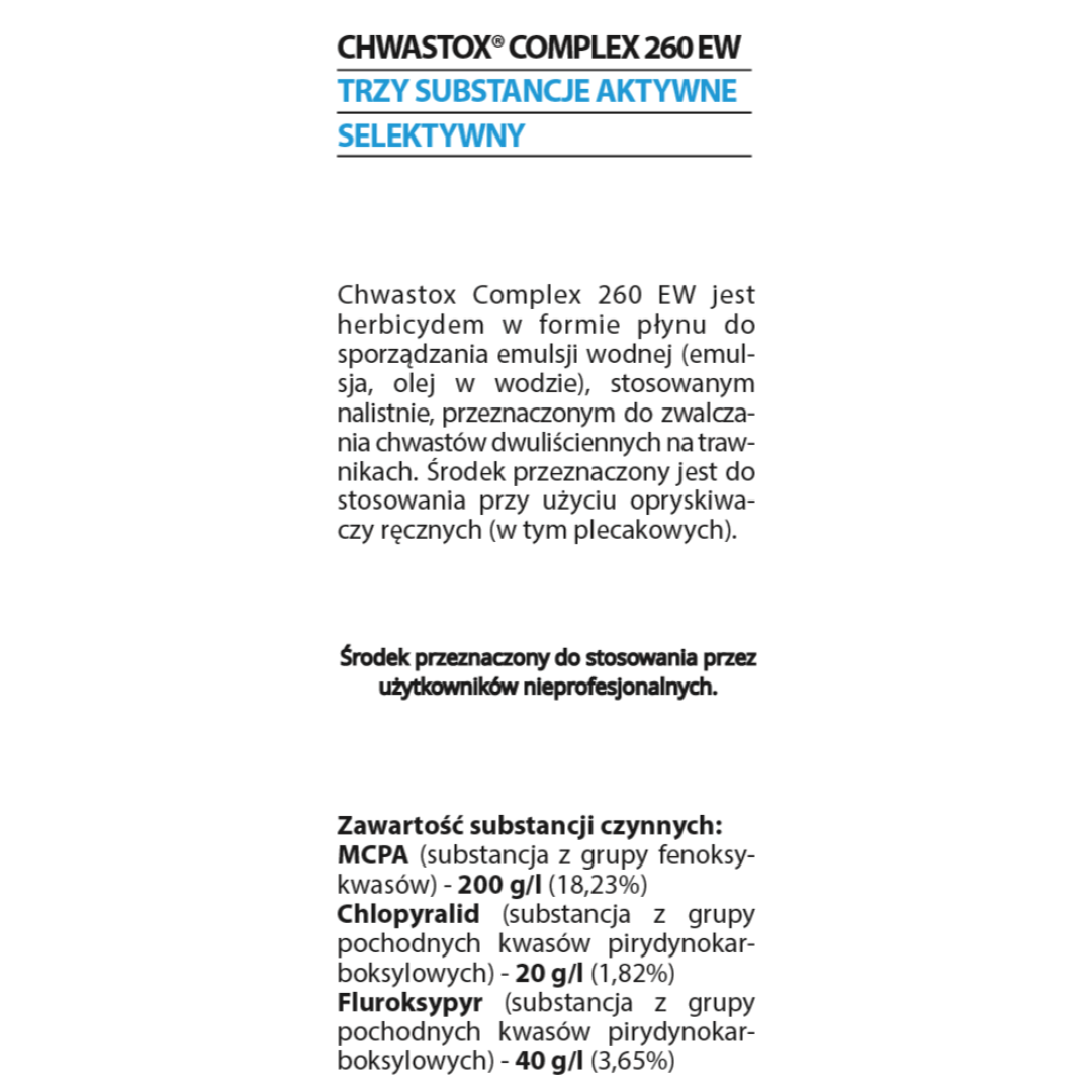 Chwastox Complex 260 EW jest w formie płynu do sporządzenia roztworu wodnego. Środek przeznaczony jest do stosowania przy użyciu opryskiwaczy ręcznych (w tym plecakowych).