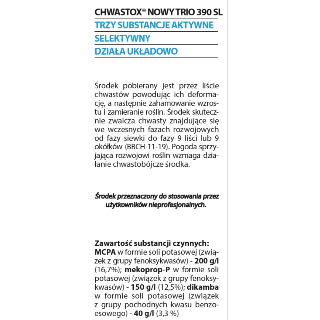 Chwastox Nowy Trio 390 SL zwalcza chwasty dwuliścienne na trawnikach działa skutecznie i długotrawle. Produkt zwalcza chwasty takie jak mniszek pospolity, pępawa zielona, rogownica pospolita, szczaw zwyczajny czy babka lancetowata. Działa kontaktowo i jest stosowany dolistnie, przenika do korzeni i powoduje ich obumierania, co przekłada się na wysoką skuteczność. Preparat jest pobierany przez liście chwastów, powoduje ich deformację, zahamowanie wzrostu i zamieranie roślin.