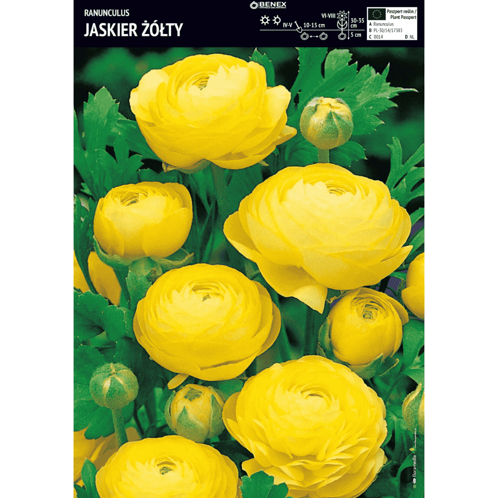 Jaskier żółty to niezwykle dekoracyjna roślina cebulowa, która zachwyca pełnymi, aksamitnymi kwiatami o intensywnym, słonecznym kolorze. Kwiaty są duże, gęsto wypełnione płatkami, tworząc niemal idealne kiliste i półkuliste kompozycje. Intensywna żółta barwa sprawia, że roślina stanowi wyrazisty akcent na rabatach, w pojemnikach lub w bukietach ciętych. Jaskier żółty kwitnie od wiosny do wczesnego lata, a jego smukłe, wyprostowane łodygi stabilnie utrzymują kwiaty, dzięki czemu doskonale nadaje się do ogrodu i na kwiat cięty.