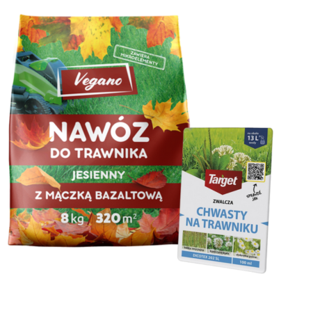 Jesienny nawóz do trawnika Vegano 8 kg + Dicotex 202 SL na chwasty na trawniku Target 100 ml (ZESTAW)