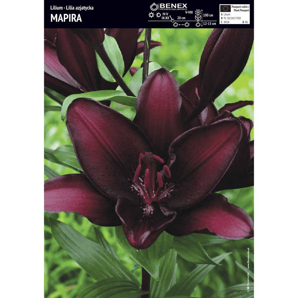 Lilia azjatycka Mapira to niezwykle efektowna odmiana o intensywnie czerwonych kwiatach, która wnosi do ogrodu energię i wyrazisty akcent kolorystyczny. Kwiaty są duże, szeroko otwarte, z lekko wywiniętymi płatkami o głębokiej, nasyconej czerwieni. Na jednym, mocnym pędzie rozwija się kilka kwiatów, które długo utrzymują walory dekoracyjne. Ciemnozielone, smukłe liście pięknie podkreślają intensywną barwę kwiatów. Lilia Maspira kwitnie latem i wyróżnia się silnymi, wyprostowanymi łodygami, dzięki czemu doskonale sprawdza się na rabatach, w grupowych nasadzeniach oraz jako kwiat cięty.