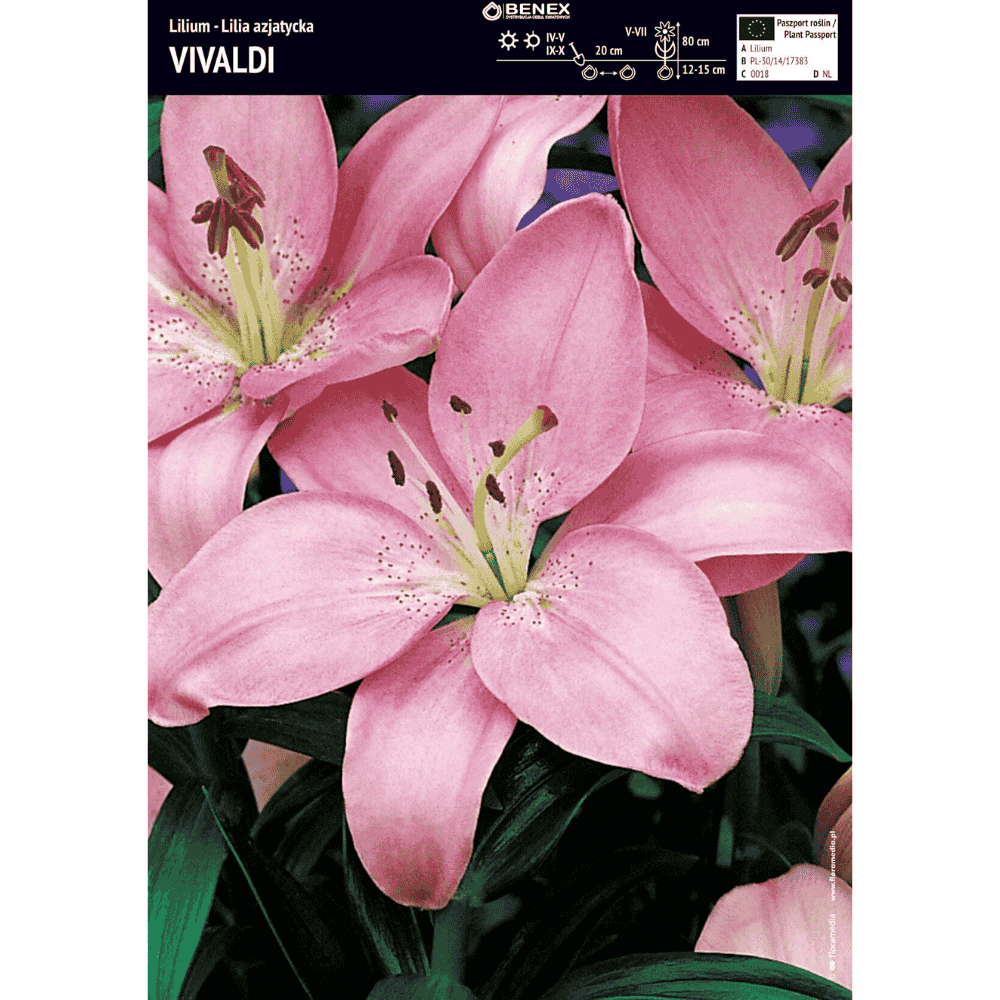 Lilia azjatycka Vivaldi to niezwykle elegancka odmiana o subtelnym, jasnoróżowym kolorze, która wnosi do ogrodu lekkość, romantyzm i harmonię. Jej kwiaty są duże, szeroko otwarte, z delikatnie zaokrąglonymi płatkami w pastelowym odcieniu różu, często z jaśniejszym środkiem. Kolor jest świeży i jasny, dzięki czemu pięknie rozświetla rabaty i doskonale komponuje się z innymi roślinami ozdobnymi. Na jednym, mocnym pędzie rozwija się kilka kwiatów, które długo zachowują dekoracyjny wygląd. Lilia Vivaldi kwitnie obficie latem i wyróżnia się stabilnymi, wyprostowanymi łodygami, co czyni ją doskonałą zarówno do ogrodu, jak i na kwiat cięty.