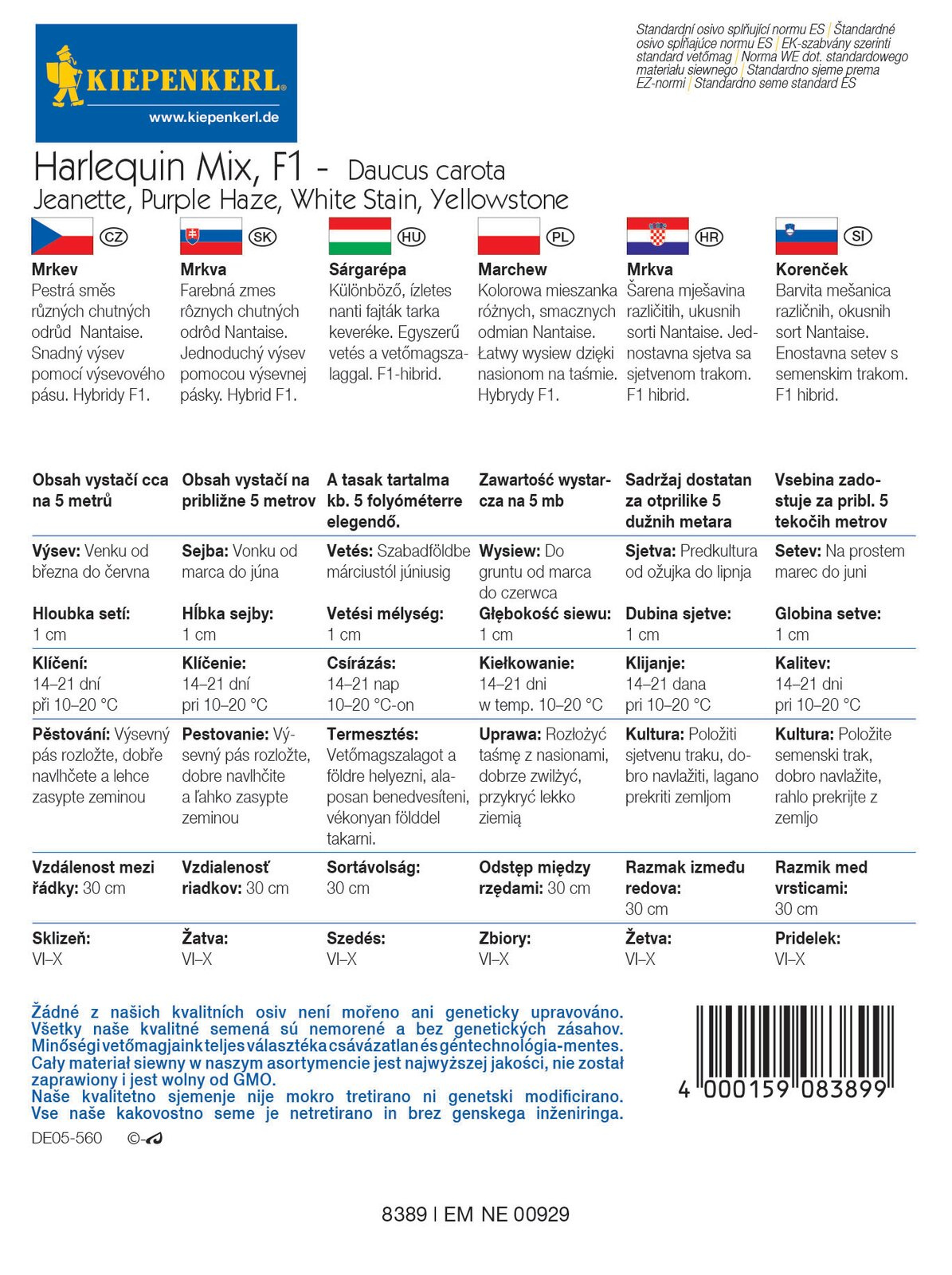 Marchew 'Harlequin' Mix (Daucus carota) to mieszanka różnych odmian marchwi umieszczonych na taśmie. Osiągnięte plony będą różniły się od siebie głównie wybarwieniem – w mieszance są odmiany od białej, przez żółtą, pomarańczową aż po fioletową. Korzenie marchwi osiągają długość do 25 cm i charakteryzują się nie tylko ciekawą barwą i atrakcyjnym wyglądem, ale przede wszystkim niezwykle słodkim smakiem, chrupkością i soczystością.