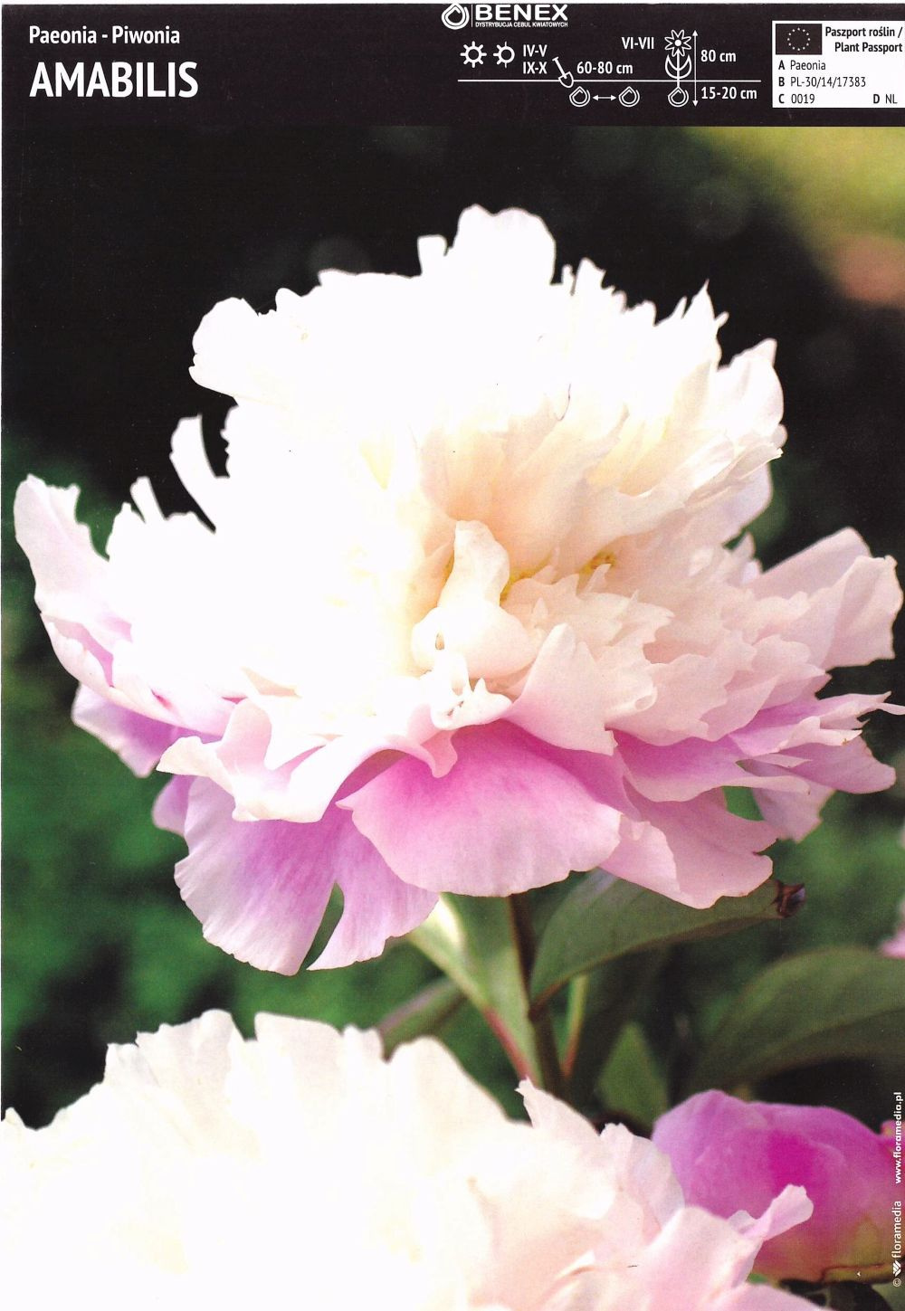 Piwonia 'Amabilis' to piękna odmiana o kwiatach w kolorze biało - różowym. Kwiatostany są duże, pełne, o karbowanych, pastelowych płatkach i bardzo delikatnym aromacie. Odmiana często uprawiana na kwiat cięty, pięknie bowiem prezentuje się we wnętrzach. Silnie się rozkrzewia i osiąga nawet 90 cm wysokości. Częścią podziemną są duże i mocno rozgałęzione karpy.