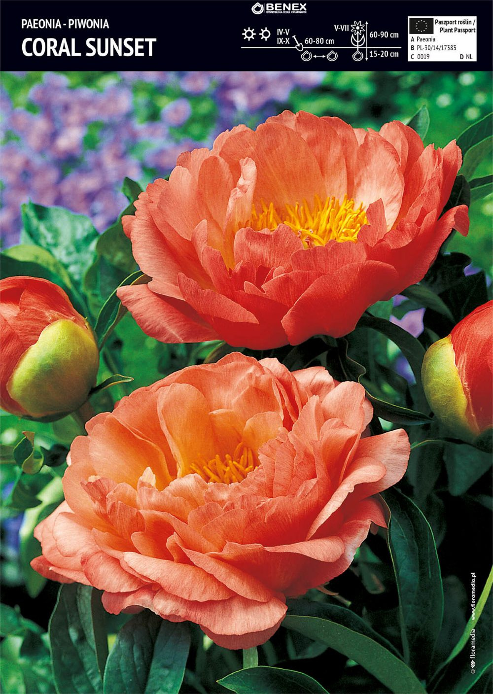 Piwonia 'Coral Sunset' to roślina o wyjątkowej urodzie i delikatności kwiatów w kolorze pomarańczowym. Kwiatostany są duże, pełne, o pastelowych płatkach i bardzo delikatnym aromacie. Odmiana często uprawiana na kwiat cięty, pięknie bowiem prezentuje się we wnętrzach. Silnie się rozkrzewia i osiąga nawet 90 cm wysokości. Częścią podziemną są duże i mocno rozgałęzione karpy.