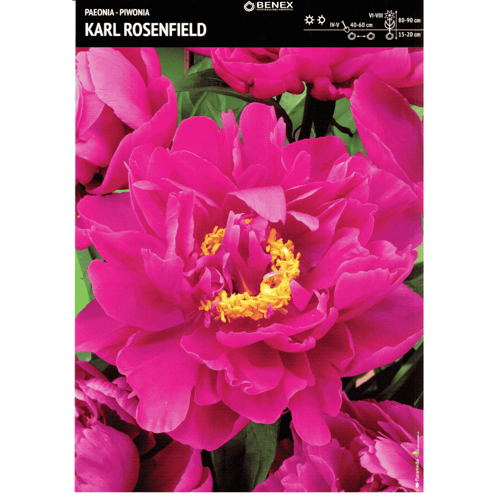 Piwonia Karl Rosenfield to odmiana piwonii dorastająca do 80-100 cm wysokości. Kwitnie w maju-czerwca, wytwarza kwiaty w bordowym kolorze. Cebulki sadzimy do gruntu w kwietniu-maja.