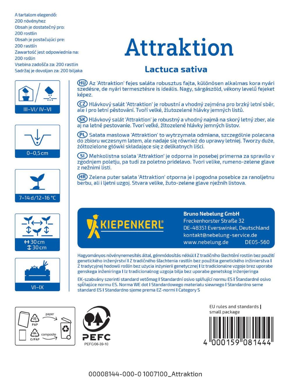 Sałata masłowa Attraktion to ceniona, wyjątkowo smaczna odmiana tworząca duże, zwarte główki o pięknie wybarwionych, jasnozielonych liściach. Jej liście są delikatne, miękkie i maślane w konsystencji, co sprawia, że idealnie nadają się do świeżych sałatek, kanapek oraz lekkich dań warzywnych. Odmiana Attraktion wyróżnia się szybkim wzrostem, równomiernym formowaniem główek oraz wysoką odpornością na choroby i niekorzystne warunki pogodowe. Doskonale sprawdzi się zarówno w uprawie wiosennej, jak i letniej.