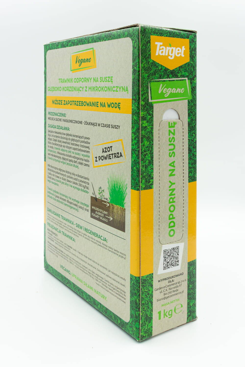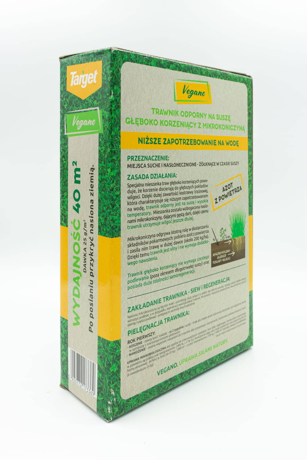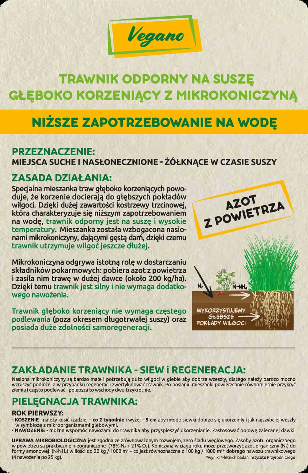Trawnik odporny suszę Vegano jest specjalnie skomponowaną mieszanką traw, które wytwarzają głęboki system korzeniowy. W ten sposób korzenie trawnika docierają do wilgotniejszych warstw gleby i jest on mniej narażony na wysychanie. Dodatkowo mieszanka ta została wzbogacona w drobnolistną koniczynę - mikrokoniczynę (Trifolium repens), która gęsto zadarnia glebę i zatrzymuje wodę w glebie hamując jej parowanie. Trawnik z tej mieszanki Vegano jest wyjątkowo odporny na braki wody w glebie, jedynie w czasie długotrwałej suszy należy go wspomóc podlewaniem. Inną zaletą takiego trawnika jest jego zdolność do samoregeneracji - mocne korzenie traw wraz z koniczyną szybko odbudowują swoją część nadziemną i przywracają piękny i zdrowy wygląd trawnika.