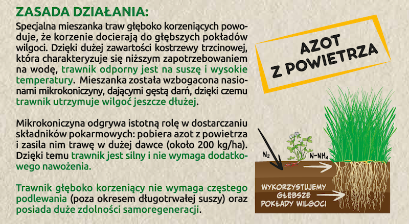 Dodatkowo mikrokoniczyna posiada właściwości absorbujące azot z powietrza, dzięki czemu trawnik nie wymaga dodatkowego nawożenia. Mikrokoniczyna sprawia, że trawnik jest miękki, bardzo gęsty i soczyście zielony przez cały sezon wegetacyjny. Co w połączeniu z trawami, które bardzo głęboko się korzenią daje trawnik doskonały na miejsca suche i mocno nasłonecznione.