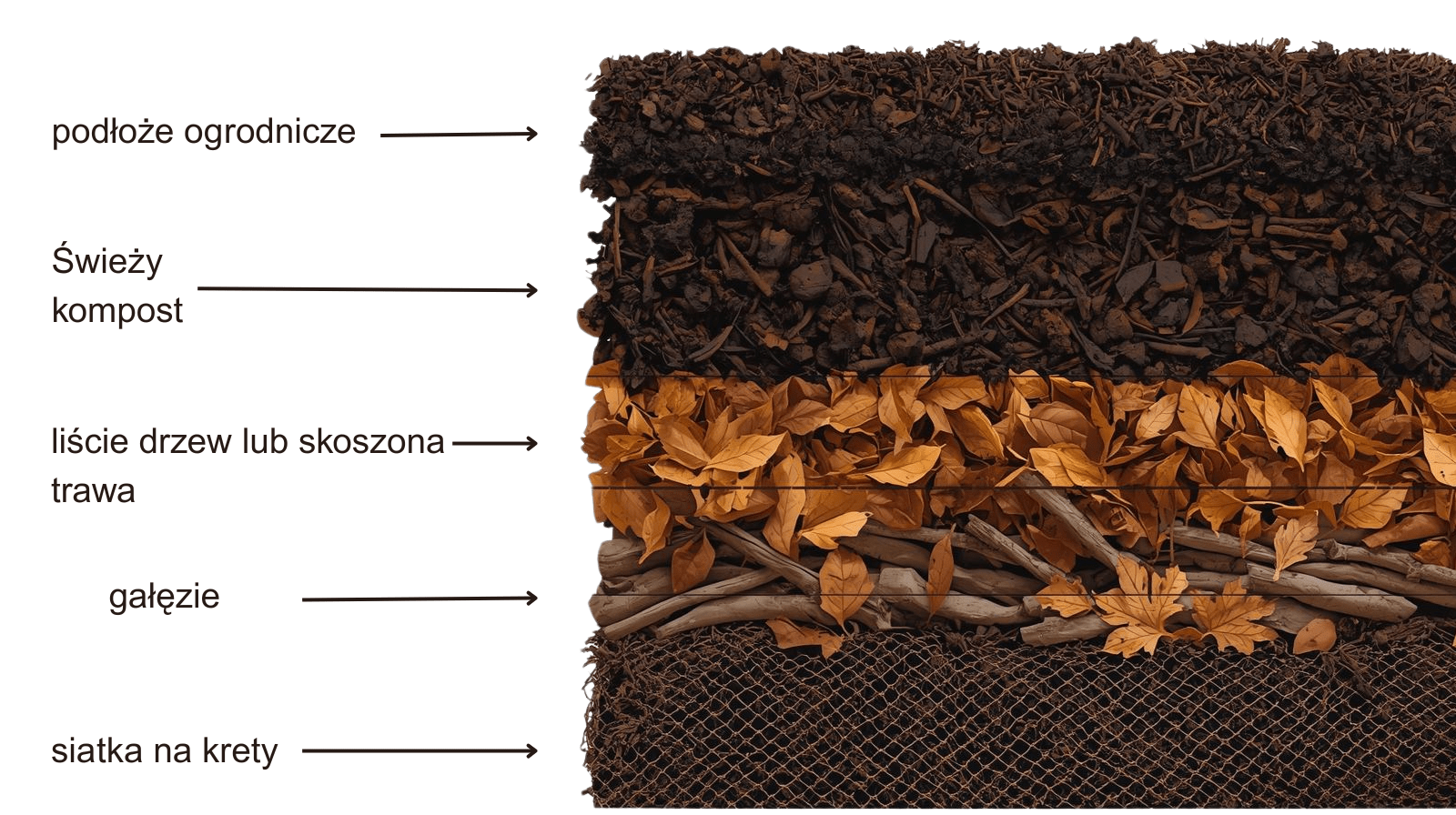 Podwyższona grządka ma też często warstwy organiczne (gałęzie, liście, kompost), które działają jak naturalny izolator i utrzymują ciepło.