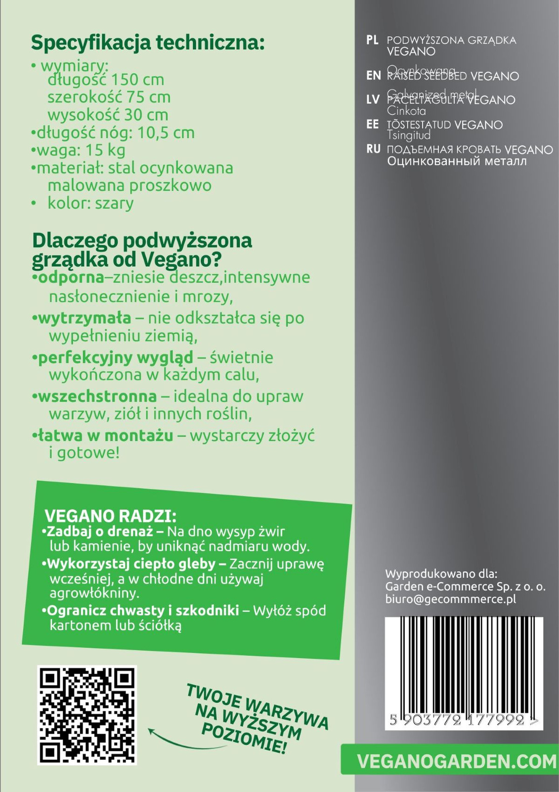 Podwyższona grządka marki Vegano to produkt wysokiej jakości, który będzie służył w ogrodzie przez wiele lat. Grządka została wykonana z ocynkowanej stali, nie jest pomalowana. Będzie doskonała do uprawiania warzyw na wysokości - to pozwala na wygodniejsze odchwaszczanie i pielęgnowanie. Dzięki podwyższonej grządce, w ogrodzie warzywnym łatwiej utrzymać ład i porządek, a prace pielęgnacyjne nie obciążają tak bardzo pleców jak w przypadku pielęgnacji roślin w gruncie.